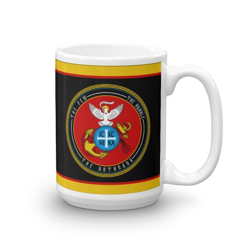 Sipping coffee or tea, and remembering that the spiritual life in Christ is a battle! We saw the symbol of the US Marines with a few alterations as a great image to help us think about life as an Orthodox Christian. Here are a few of the key alterations: (1) Instead of the Globe, we have included the Cross ("...through the Cross, joy has come into the World) and ICXC NIKA (Jesus Christ Conquers). (2) Instead of the Eagle, we have included the Dove (the symbol of the Holy Spirit as well as Peace) holding a banner bearing Semper Fidelis "Always Faithful" ("...Thy faithfulness is unto all generations" -Psalm 119). (3) The original design's Anchor has been kept ("..the anchor of hope" Hebrews 6:19) which not only is a symbol of hope, but of the stability and strength of the Holy Church of Christ amidst the stormy seas of this fallen and sinful world. (4) Finally, instead of the sailing ropes, we have included a Prayer Rope which reminds us of the importance of fervent, unceasing prayer (1 Thess. 5:16). • Ceramic • Dishwasher and microwave safe • White and glossy